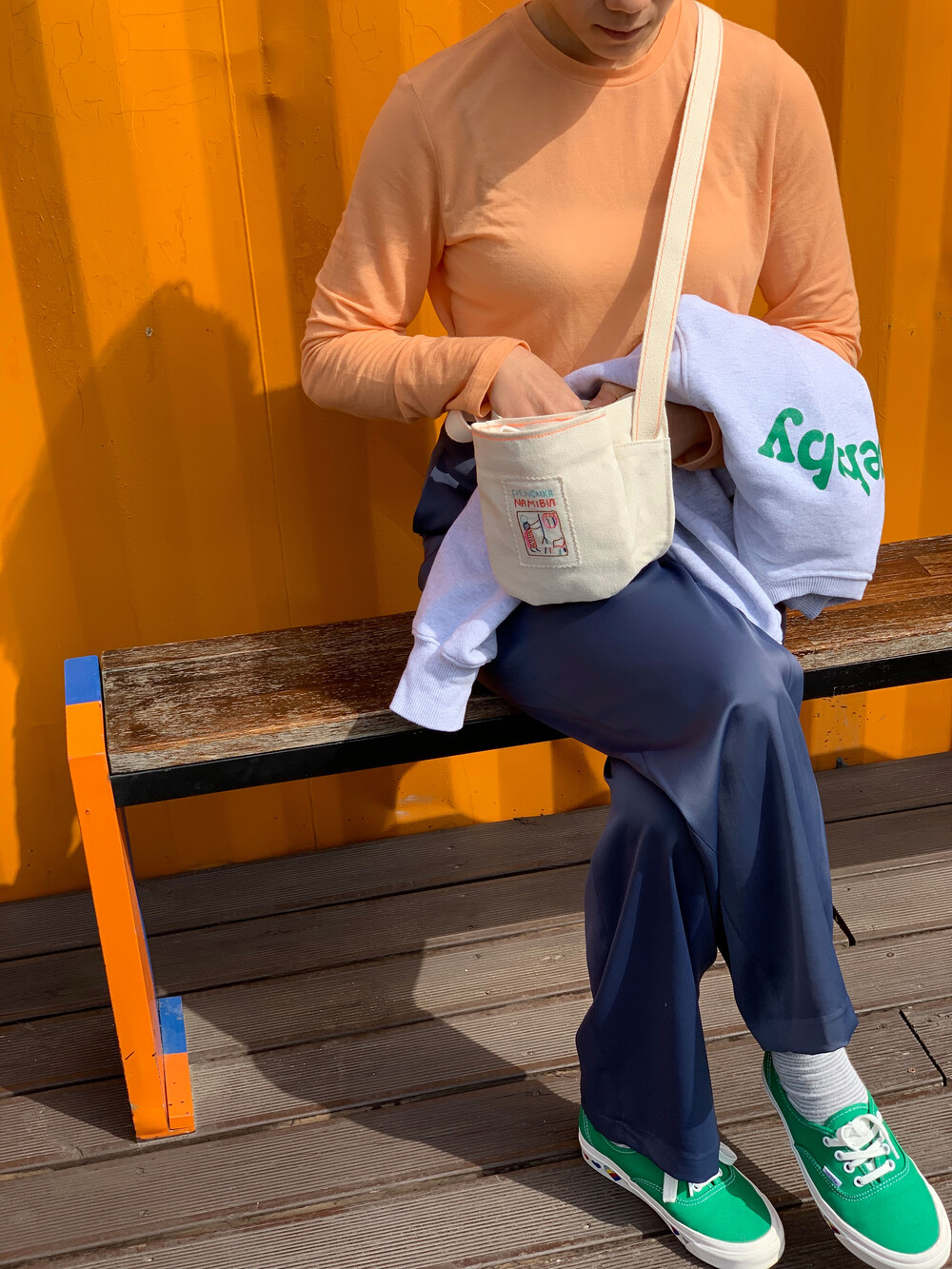 body : 앞쪽 주머니 14(W)*16(L)cm 뒷쪽 주머니 18(W)*16(L)cm*6(D)cm / strap : 145cm max.