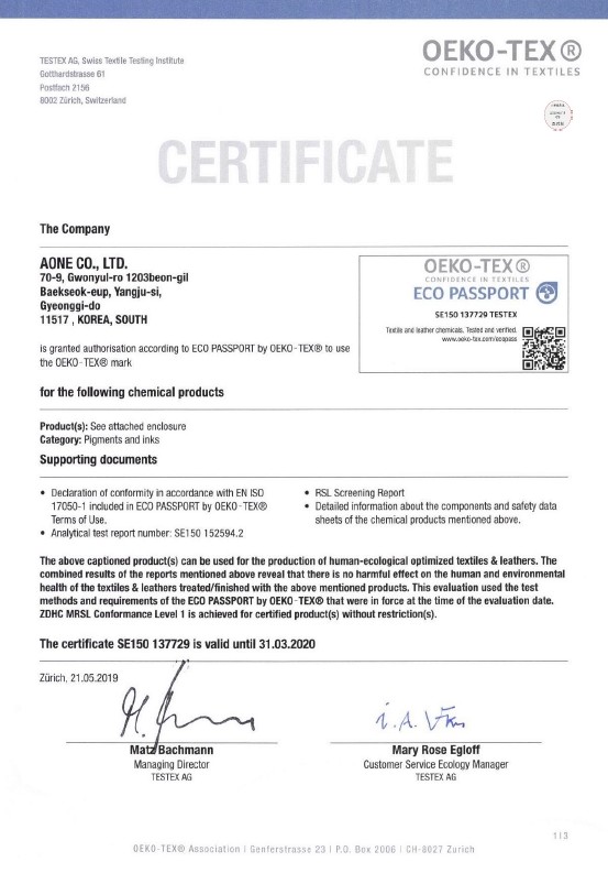 티셔츠 프린트에 사용된 염료는 유럽의 친환경 텍스타일 인증 업체인 OEKO-TEX 의 인증 기준을 통과하였습니다.