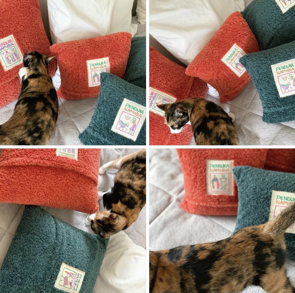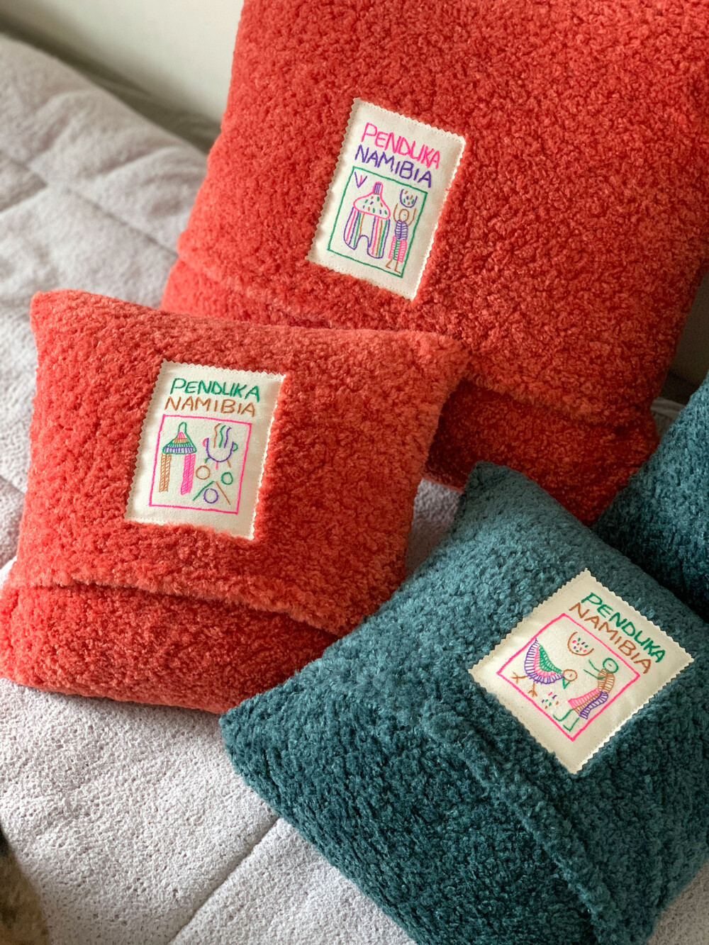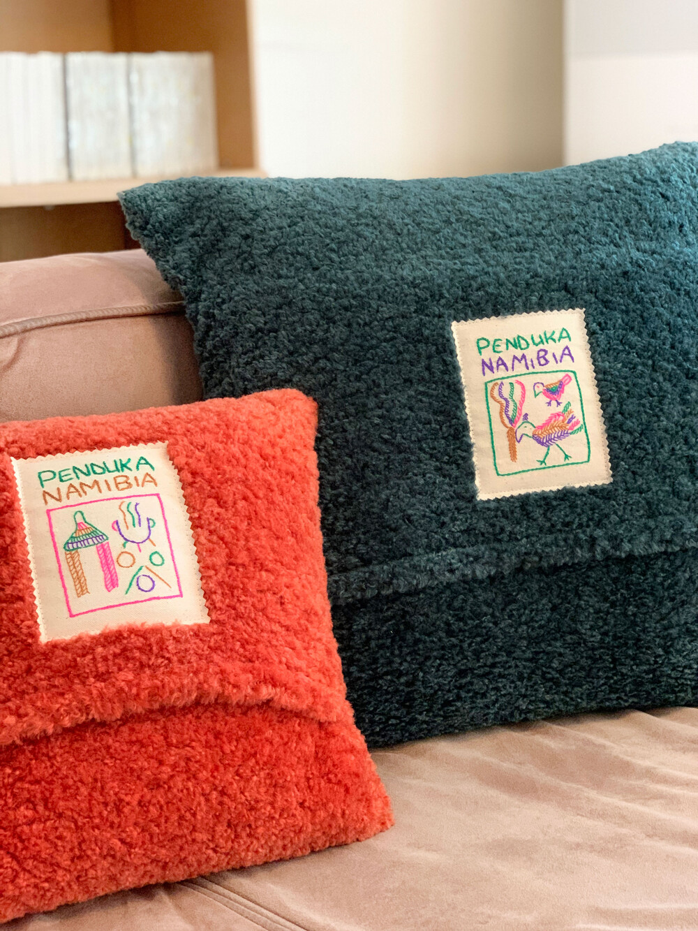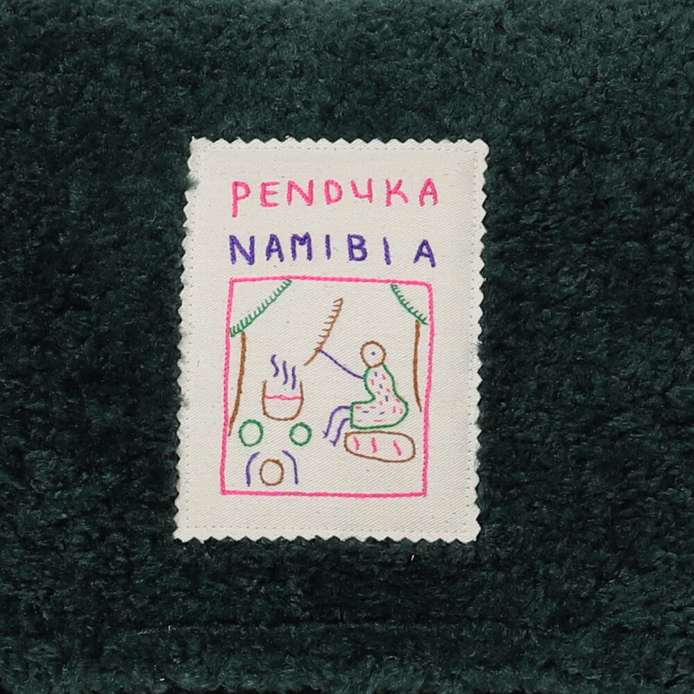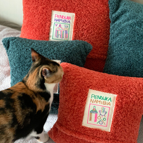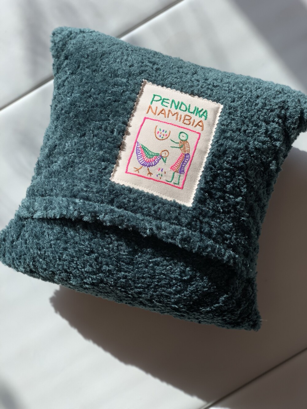 허그미쿠션에는 나미비아 여성이 손으로 수를 놓은 손자수 패치가 달려있어요.