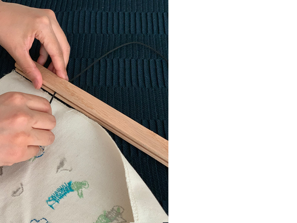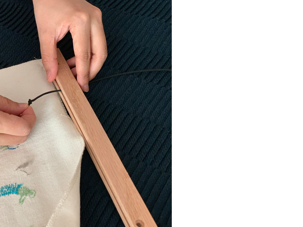 6. 끈을 위로 바짝 당긴 후 자수 패브릭을 우드스틱 안으로 살살 넣어주세요.